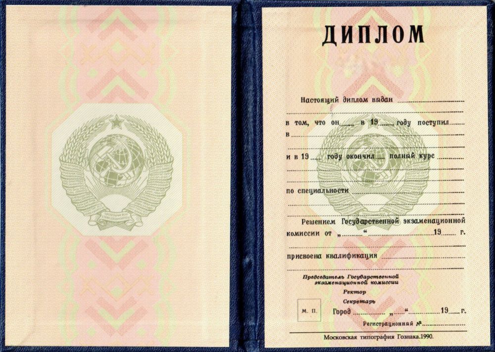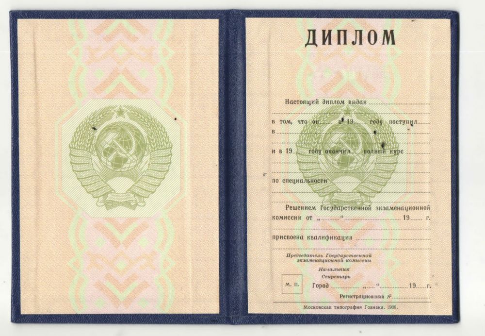 С конца прошлого тысячелетия наша компания поставляет клиентуре качественные дипломы ВУЗа СССР, созданные на настоящих бланках тех времен. Бумага защищена настолько, насколько это было возможно, а печати и подписи копируются вручную с аналогичных «корочек» старого образца. Заполнение осуществляется по стандартам нужного года выпуска, потому с копией советского диплома не страшно устраиваться на работу. Вас никогда не поймают на подделке, потому что документ снабжен:
